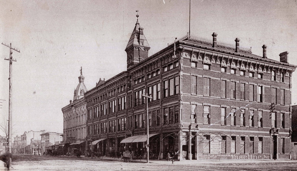 At the corner was the Pruden Block, a mid-Victorian style structure which was built in 1878 and said to be “the first major commercial building of extensive size in Dayton.”