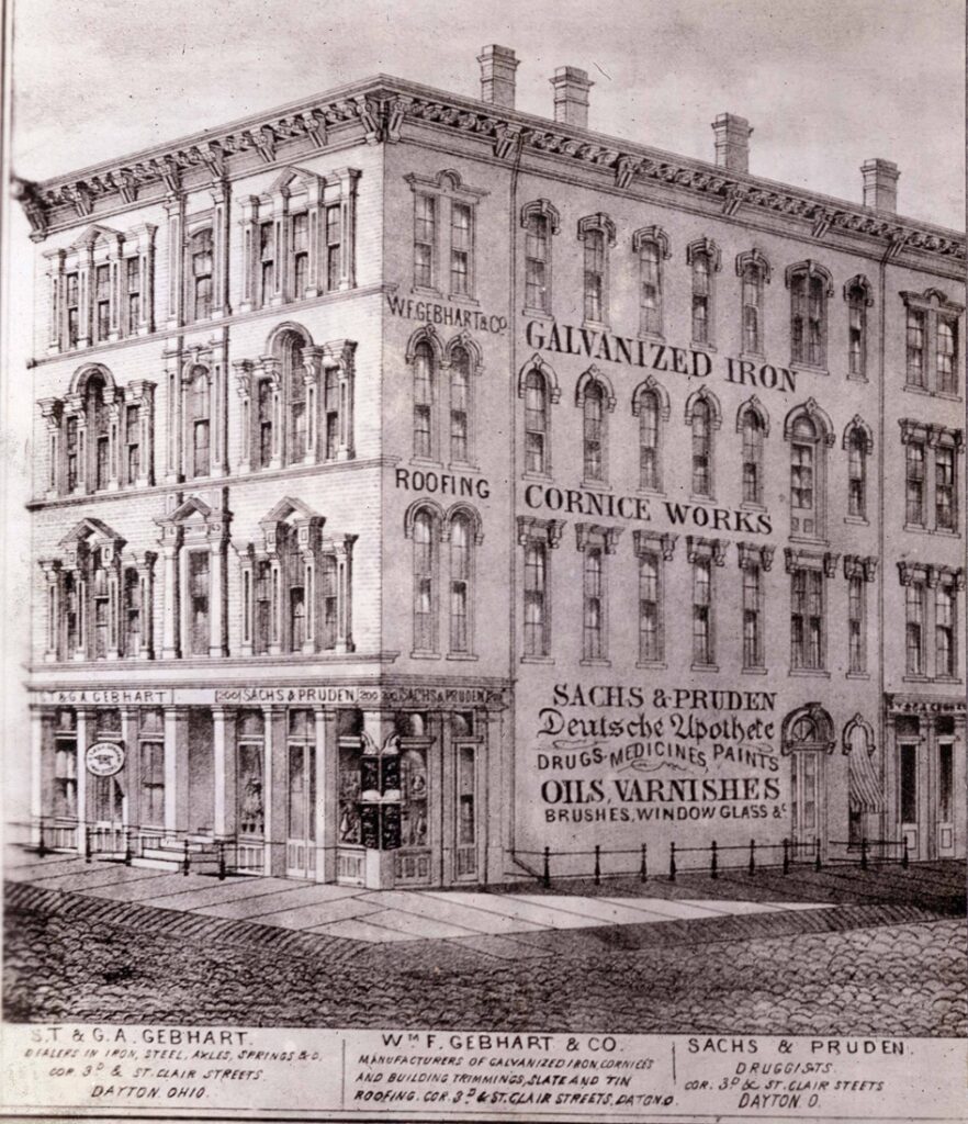A variety of tenants are visible, including the Sachs and Pruden drug store, S. T. and G. A. Gebhart (dealers in iron, steel, axles, and springs) and our W. F. Gebhart who is advertised at that time as a manufacturer of “galvanized iron, cornices and building trimmings, (and) slate and tin roofing.”