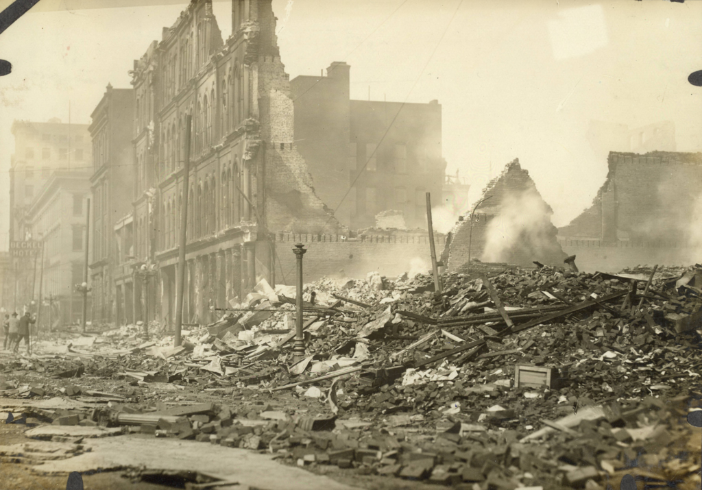 That district’s name dates back to the Great Flood of 1913, but as the name indicates, the most destructive force on this block was fire, not water. Flames from a gas explosion at the Burkhardt and Rotterman drugstore at the NW corner of East Third and St. Clair spread through the whole block which consisted primarily of wood frame buildings that were highly vulnerable to fire.