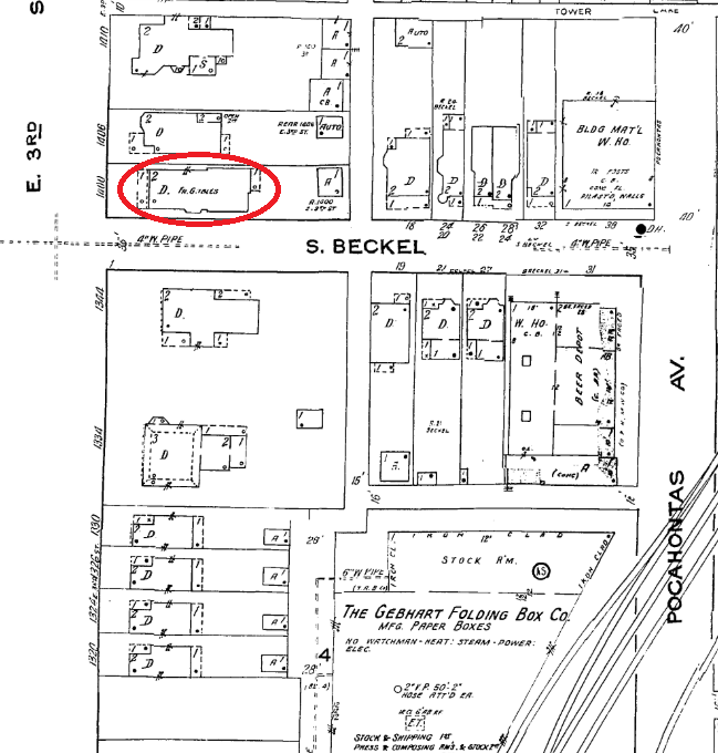 This 1950 map shows 1400 E Third (circled) and we can see two more large homes on the block west of Beckel St, as well as more residences on both sides of Beckel.