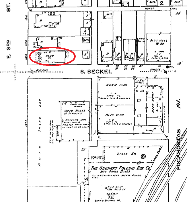 But just 5 years later in 1955, we see some big changes. 1400 E Third has changed from a dwelling to a “clubhouse,” and the homes next to it across Beckel are gone and replaced by an auto sales lot. The homes on the W side of Beckel were razed for what was a beer warehouse at that time.