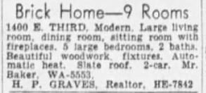 It had been listed for sale in 1949, with the listing describing it as “Modern. Large living room, dining room, sitting room with fireplaces. 5 large bedrooms. 2 baths. Beautiful woodwork, fixtures. Automatic heat. Slate roof. 2 car.”