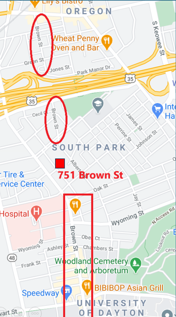 In particular, two roadways help tell the story. First, highway US-35 a couple blocks to the north of the Flats site is a major force that significantly reshaped the area, but Brown Street is also key to understand its trajectory.