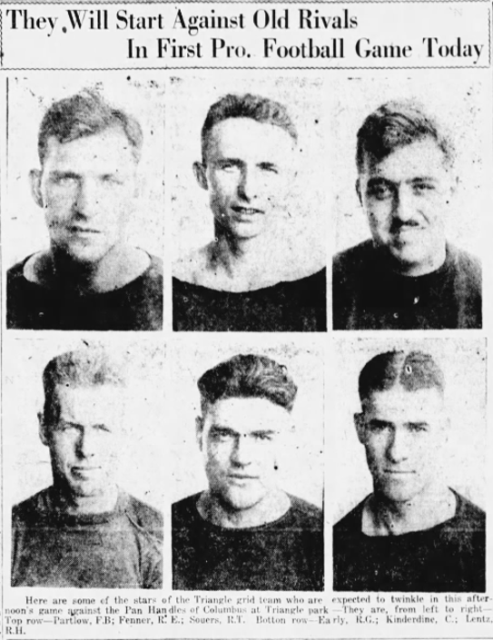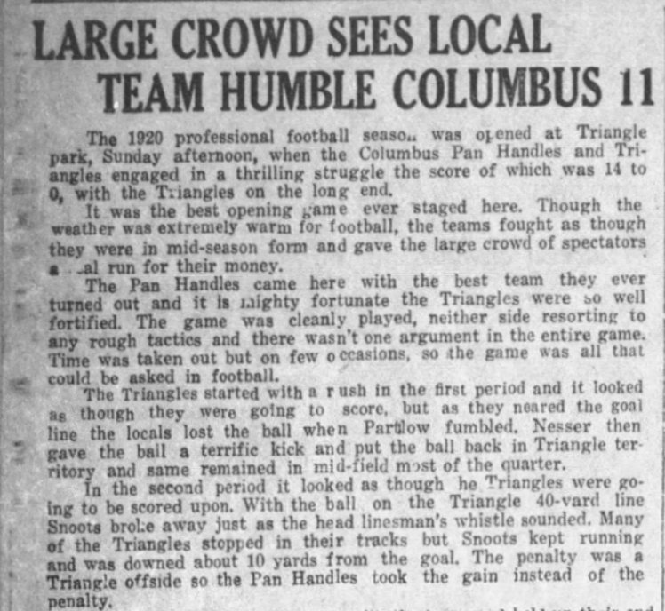 The famous inaugural game of the league at Triangle Park was a 14-0 Dayton win over the Columbus Panhandles.