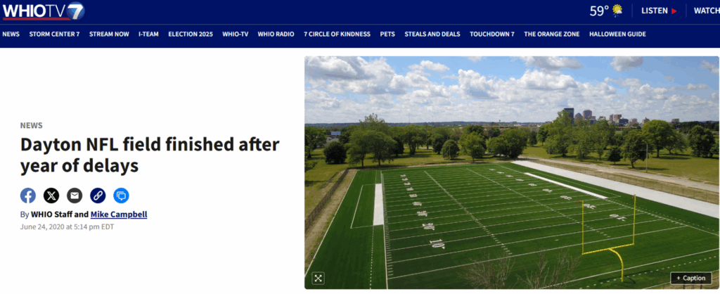 Also in the last few years, Allen Farst wrote and directed a documentary film called Triangle Park featuring major NFL names such as Cris Collinsworth, Larry Fitzgerald, Eric Dickerson, Kirk Herbstreit, Sean McVay, Troy Aikman, and many more to tell the story of the historic game in Dayton. There were screenings at the local Neon Movie Theater and at AMC theaters in every NFL market, but a digital release on Amazon Prime has been postponed while the team reviews a new potential deal for longer-term stability for the film.