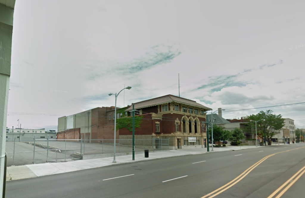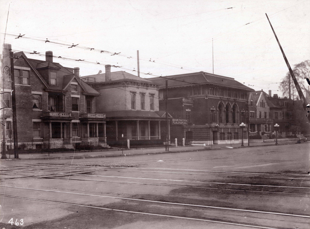 In the historic image below, we see a series of residential structures surrounding the Eagles Building which have since been removed.