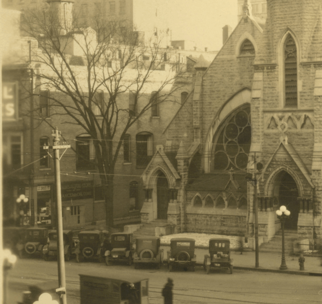 Signage for that drug store and the west side of the Young Building is visible in another image of the old corner church: