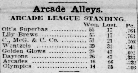 Originally there were 5 lanes on the first floor and 5 on the second. Newspaper articles from those years cover “the Arcade Bowling League” at the “Arcade Alleys,” whose teams in those years included the Arcades, Walnut Hills, Olt’s Superbas, Lily Brews, and more (DDN 12/16/07, Dayton Herald 3/30/10).