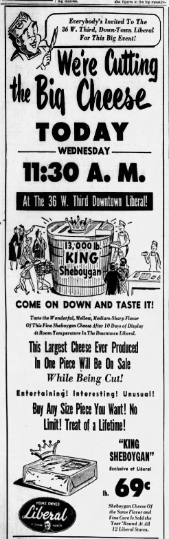 In 1954 the downtown store announced an unusual event: the cutting of a huge piece of Sheboygan cheese, “the largest cheese ever produced in one piece” which had been on display for 10 days and would be offered for sale while its was being cut.