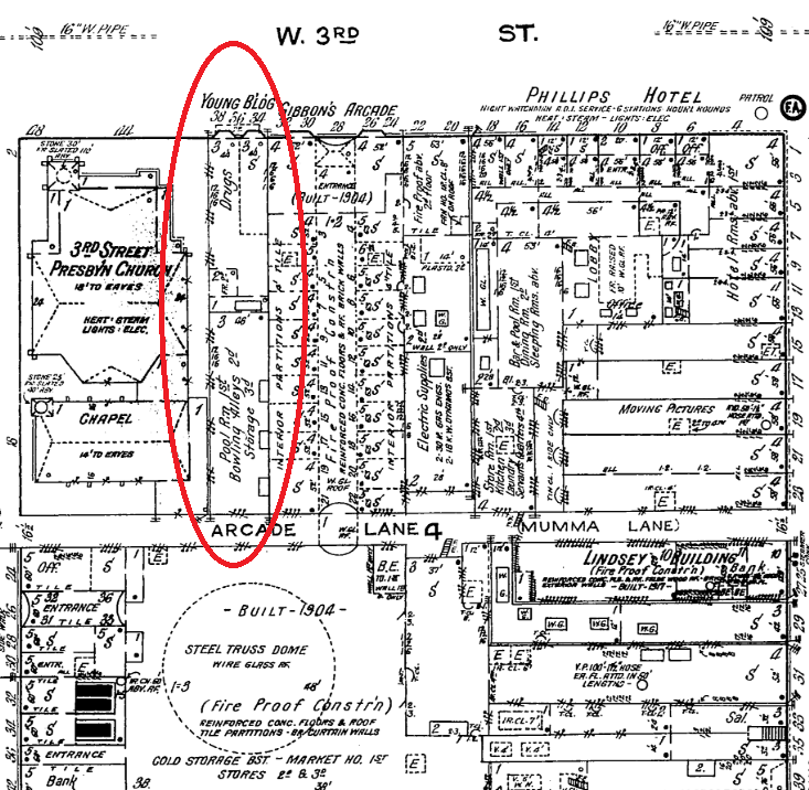 By 1918, we can see in the map below that there was a drug store out by the Third Street entrance, with a pool room behind that on the first floor, bowling alleys on the second, and storage on the third.