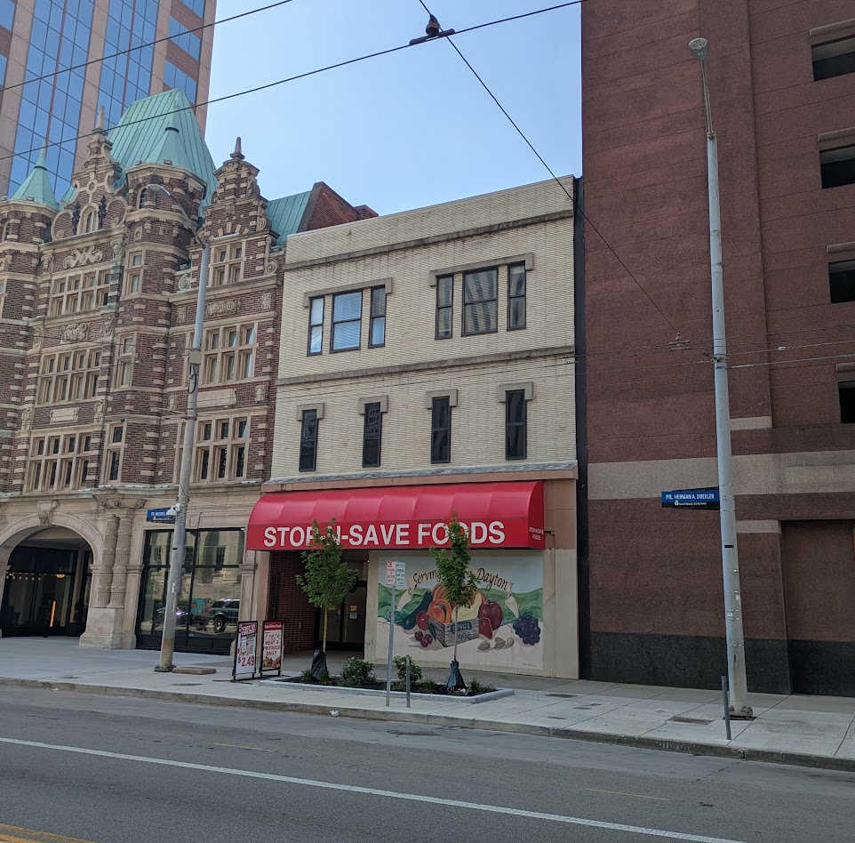 In the early 90s, Schear’s Marketplace not only sold groceries but also had a dry cleaner (Clean Scene), a premium florist (Colonial Flowers), and downtown’s last independent pharmacy (Carl Schmidt Drug Store, founded in 191, formerly at 114 W. 5th and then 5th and Ludlow before taking a 540-square foot corner of 36 W Third in 1990). The drug store would close in 1995 when the pharmacist, Howard Faust, moved to the Revco Drug Store at Fourth and Main) (DDN 6/25/90, 2/10/95).